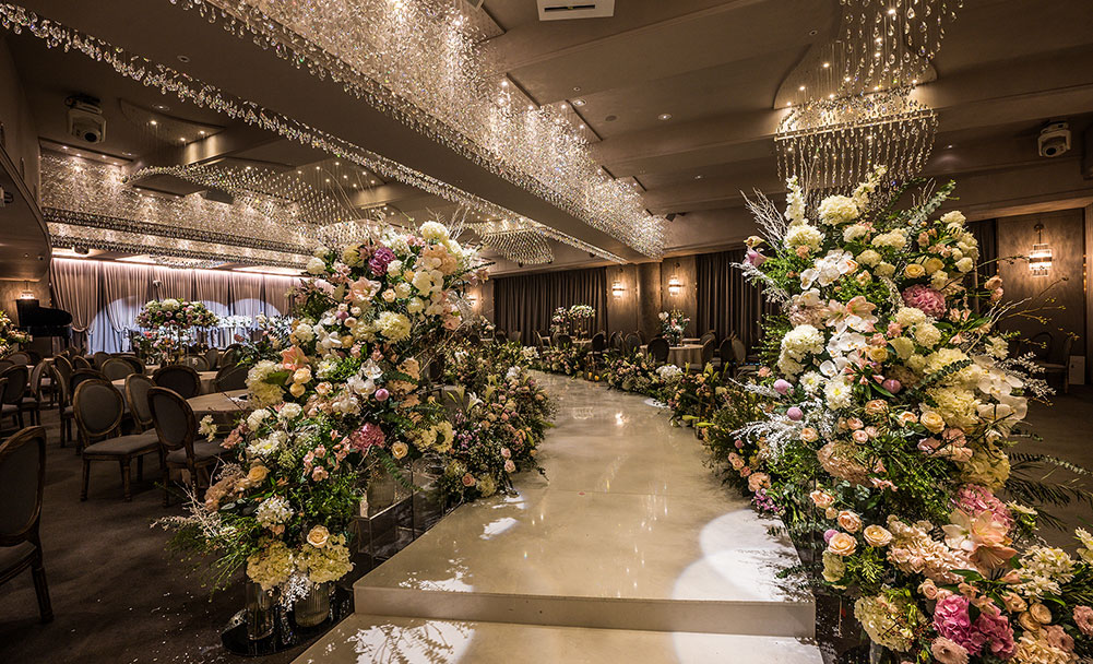 17미터 폭의 홀을 가득 채운 로맨틱하고 환상적인 물방울 크리스탈 샹들리에와 화사한 아이보리 톤의 임페리얼볼룸을 만나보세요.